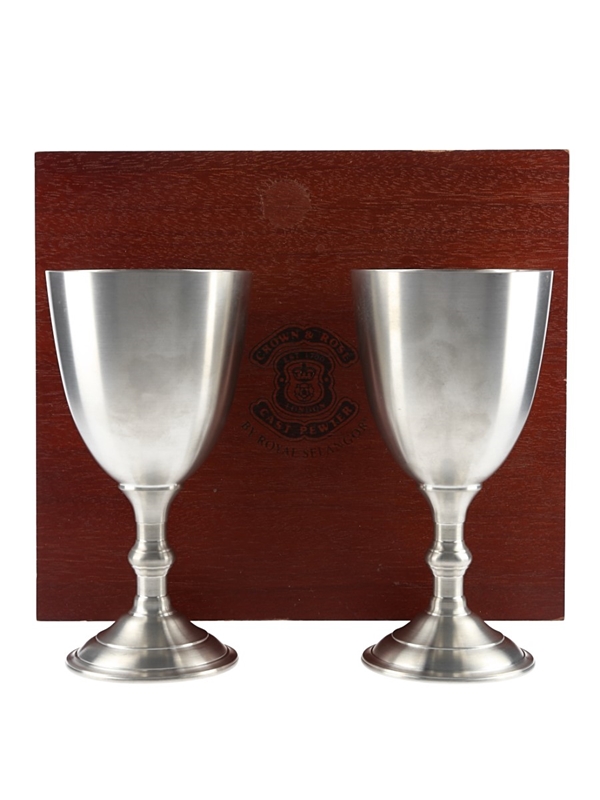 This lot contains two branded Crown & Rose glasses by Royal Selangor cast in pewter and presented in a wooden box.