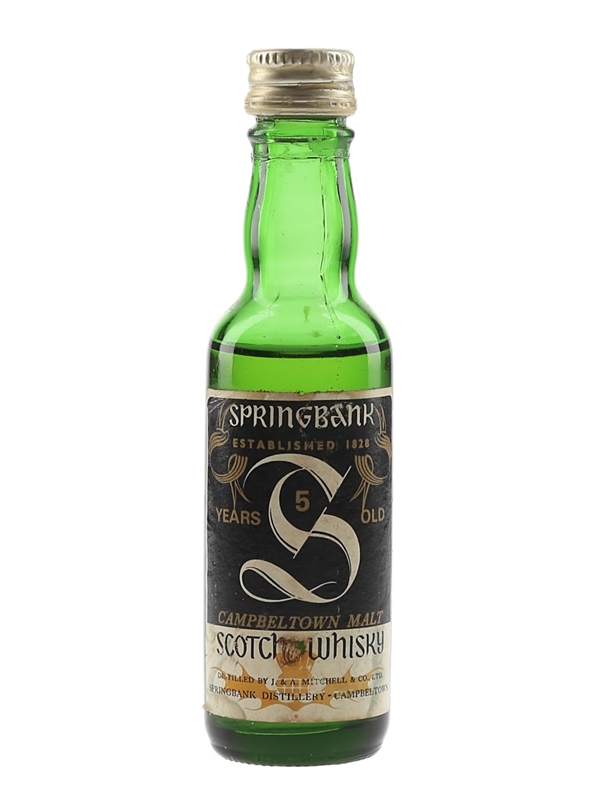 A miniature bottle of Springbank 5 Year Old Campbeltown Malt Scotch whisky. This was imported to Italy by Consorzio Vinicolo A Sutti, we estimate in the 1970s.