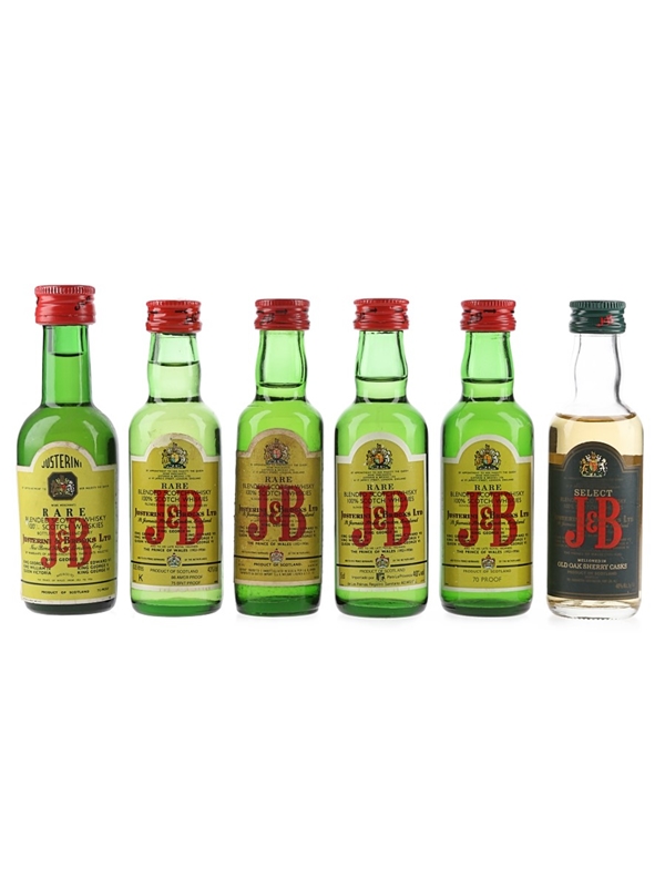 This lot contains six miniature bottles of J&B Rare and Select blended Scotch whisky. We estimate these were bottled in the 1970s to 1990s.