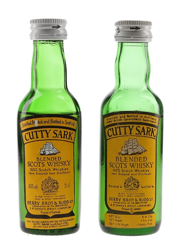 This lot contains two miniature bottles of Cutty Sark Blended Scots Whisky produced by Berry Bros & Rudd Ltd. We estimate these were bottled in the late 1970s to early 1980s.