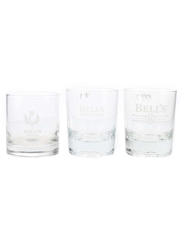 This lot contains three branded Bell's Whisky tumblers. These glasses measure approximately 8cm to 9cm tall and 7cm wide.