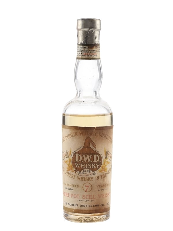 A miniature bottle of DWD Dublin Whisky Distillery 7 Year Old, The Finest Whisky in the World, produced at Jones Road Distillery and bottled by The Dublin Distillers Co., Ltd. We estimate this was bottled in the 1930s.