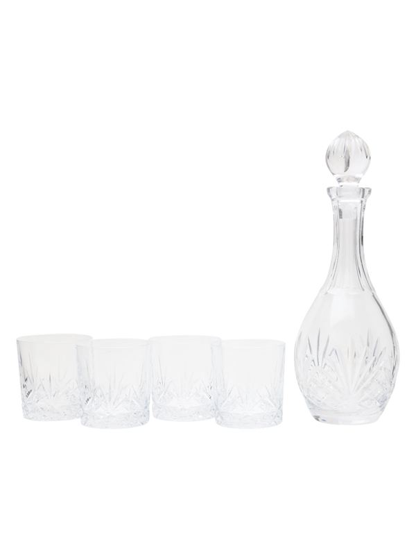 A set containing a cut-glass decanter with stopper, and four tumblers. The decanter holds approximately 70cl.