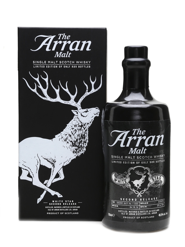 A bottle of Arran White Stag. This second release was distilled in 1996 and matured in a single sherry butt before bottling in 2016. The cask was selected by a tasting panel for the White Stag Community of Arran Friends Worldwide.