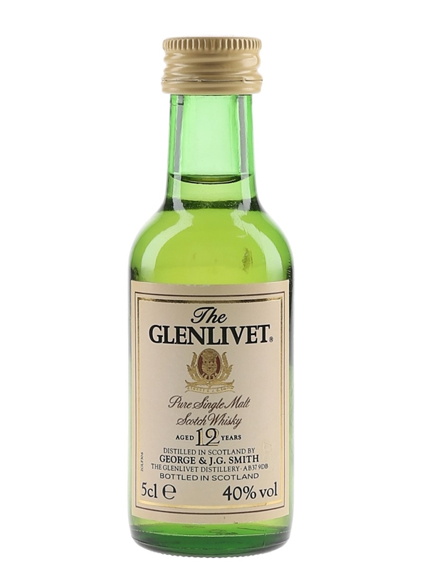 A miniature bottle of The Glenlivet 12 Year Old Pure Single Malt Scotch Whisky, distilled in Scotland by George & J G Smith. We estimate this was bottled in the 1980s.