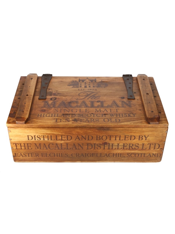 A branded The Macallan 10 Year Old wooden whisky box with The Macallan Logo on the top and the text 'Distilled and Bottled Macallan Distilliers LTD. Easter Elchies, Craigellachie, Scotland'. The box measures approximately 46cm wide, 16.5cm tall, and 28cm deep.