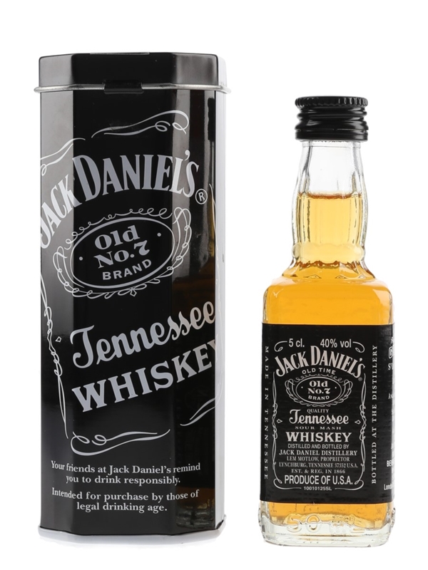 A miniature bottle of Jack Daniel's Old Time Old No. 7 Brand Quality Tennessee Sour Mash Whiskey, distilled and bottled by Jack Daniel Distillery Lem Motlow, Prop. Inc. This is presented in a branded tin.