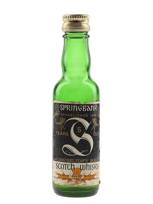 A miniature bottle of Springbank 5 Year Old Campbeltown Malt Scotch Whisky. This was imported to Italy by Consorzio Vinicolo A Sutti, we estimate in the 1970s.