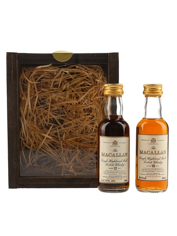 This lot contains two miniature bottles of The Macallan 12 and 18 Year Old Single Highland Malt Scotch Whisky in a wooden box. We estimate these were bottled in the 1980s.