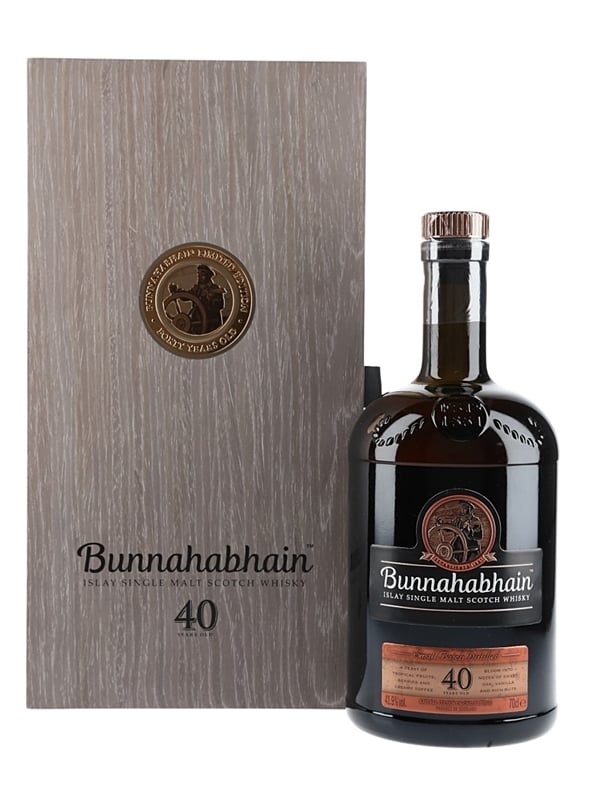 A bottle of Bunnahabhainn 40 Year Old Islay Single Malt Scotch Whisky. This 2018 release was matured in Turney casks (sourced from Glasgow wine merchant J G Turney) and bottled at 41.9% ABV.