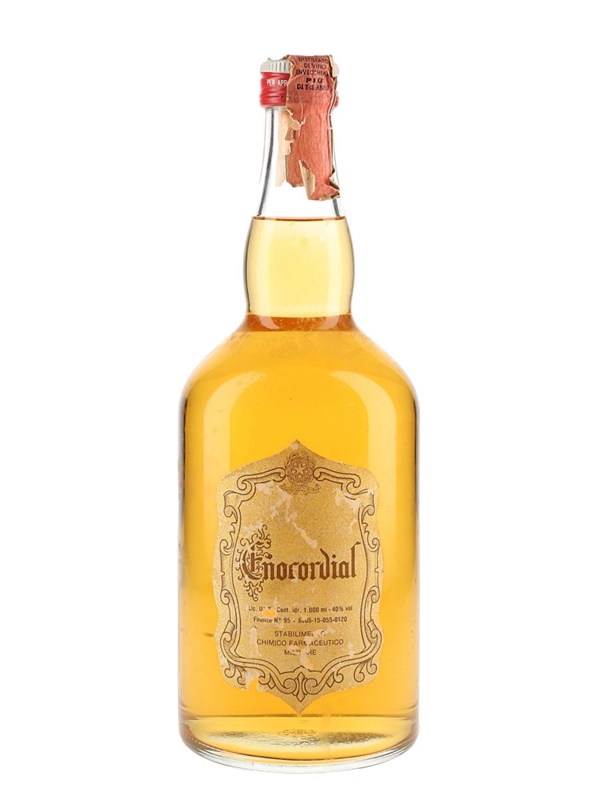 A litre bottle of Enocordial liqueur produced in Italy at a military pharmaceutical chemical establishment and bottled at 40% ABV. We estimate this was bottled in the 1980s.