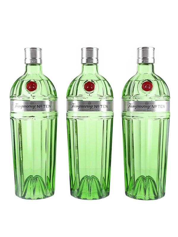 This lot contains three one-litre bottle of Tanqueray No.Ten small batch gin distilled with Export Quality. This was named after the No. 10 still in which it was made. This was produced in Britain for Charles Tanqueray & Co. Lakeside Drive, Park Royal, London.