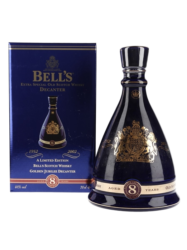 A blue ceramic decanter from Wade containing Bell's 8 Year Old blended Scotch whisky, which was released to celebrate the golden jubilee of Queen Elizabeth II in 2002.