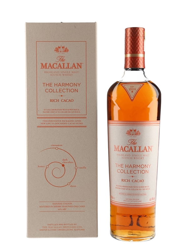 A bottle of The Macallan Rich Cacao Highland Single Malt Scotch Whisky from The Harmony Collection, bottled at 44% ABV. This is inspired by the chocolate creations of Spanish chef Jordi Roca, pastry chef at El Celler de Can Roca. The restaurant was twice voted best restaurant in the world.