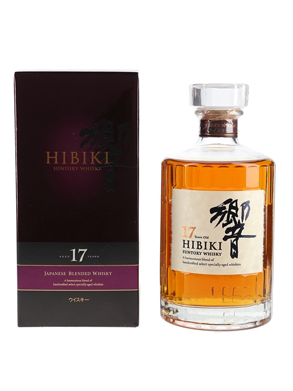 A bottle of Hibiki 17 Year Old Suntory Japanese blended whisky, imported to the UK by Morrison Bowmore Distillers Ltd.