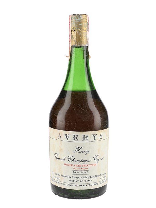 A bottle of Harvey Grande Champagne Cognac Single Cask Selection. This early landed Cognac was distilled in 1962, landed in England in 1963 and was bottled in 1977 by Averys of Bristol Ltd. in England.