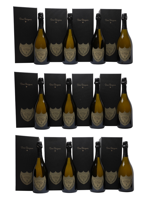 This lot contains 12 bottles of 2010 Dom Pérignon vintage Champagne, a blend of 54% Chardonnay and 46% Pinot Noir.