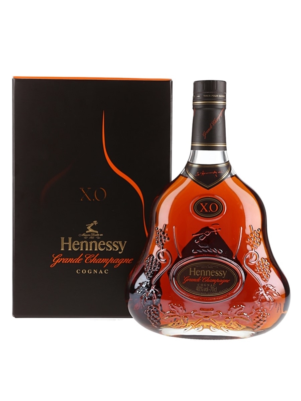 A bottle of Hennessy XO Grande Champagne Cognac. This expression was produced solely from grapes grown in the Grande Champagne region and was released in 1998 to commemorate 50 years of the XO bottle design.