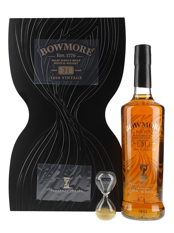 A bottle of Bowmore 31 Year Old Islay Single Malt Scotch Whisky from the Timeless Series. This was distilled in 1988, matured in bourbon casks for 29 years, before finishing for two years in Matusalem sherry seasoned butts. It was bottled at 45.4% ABV and is one of 3000 bottles.