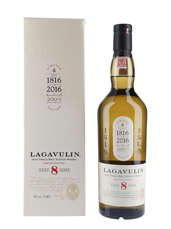 A bottle of Lagavulin 8 Year Old Limited Edition Islay Single Malt Scotch Whisky. This was released to commemorate the 200th anniversary of the founding of Lagavulin distillery by John Johnston in 1816.