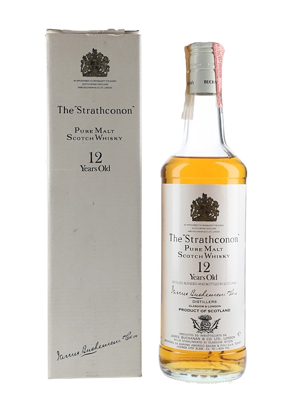 A bottle of Strathconon 12 Year Old Blended Malt Scotch Whisky, bottled by James Buchanan for Italian importer Amerigo Sagna. We estimate this was bottled in the 1980s.