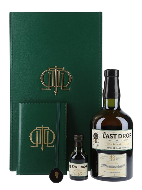 A bottle of 48 Year Old blended Scotch whisky from The Last Drop Distillers Limited. This is a blend of malt and grain whiskies, the youngest of which was distilled in 1965. For the last 27 years of maturation, the whisky was matured in ex-bourbon casks before bottling at cask strength on 10 September 2014.