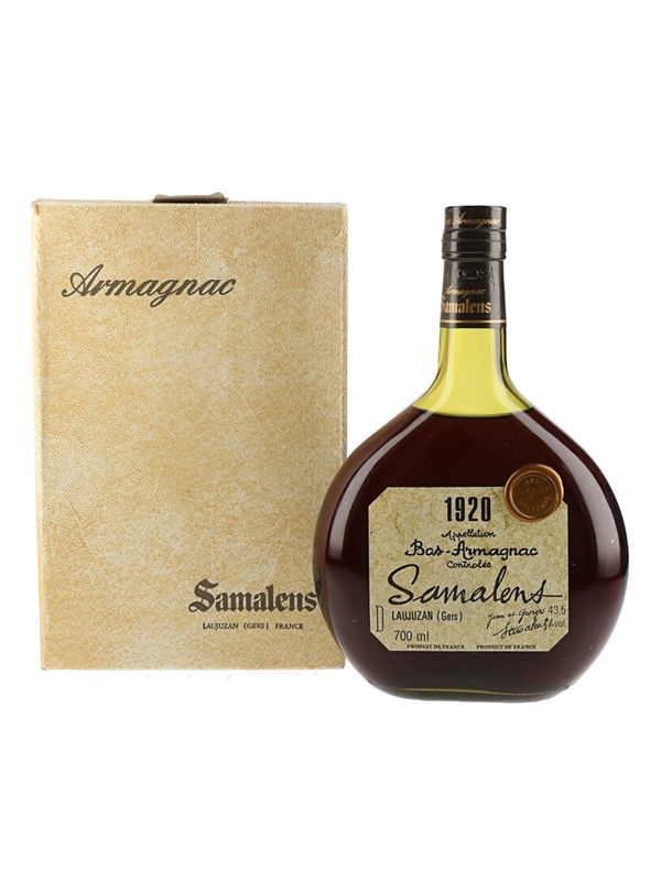 A bottle of Samalens 1920 Bas Armagnac bottled at 43.5% ABV. We estimate this was bottled in the 1970s.
