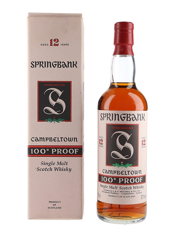 A bottle of Springbank 12 Year Old 100° Proof Campbeltown Single Malt Scotch Whisky. We estimate this was bottled in the 1990s.