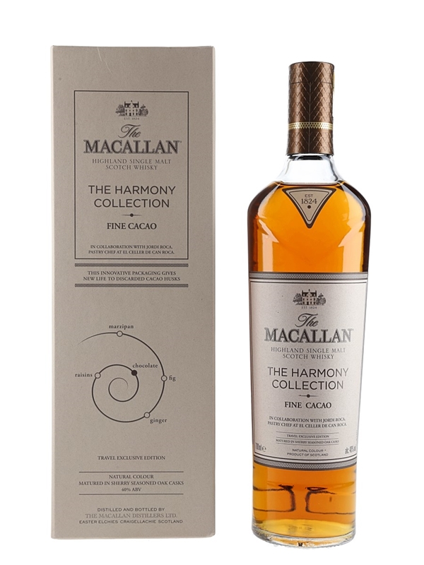 A bottle of The Macallan Fine Cacao Highland Single Malt Scotch Whisky from The Harmony Collection. This is inspired by the chocolate creations of Spanish chef Jordi Roca, pastry chef at El Celler de Can Roca. The restaurant was twice voted best restaurant in the world.