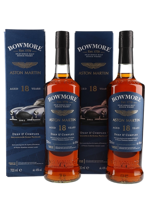 This lot contains two bottles of Bowmore 18 Year Old Islay Single Malt Scotch Whisky made in collaboration with Aston Martin. This was matured in a combination of Oloroso and Pedro Ximenez Sherry casks.
