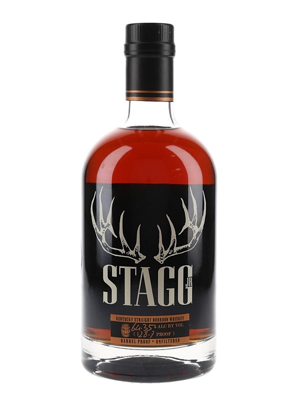 A bottle of Stagg Jr Barrel Proof Kentucky Straight Bourbon Whiskey bottled at a cask strength of 64.35% ABV by Buffalo Trace distillery. This was imported to the UK by Hi-Spirits Ltd.