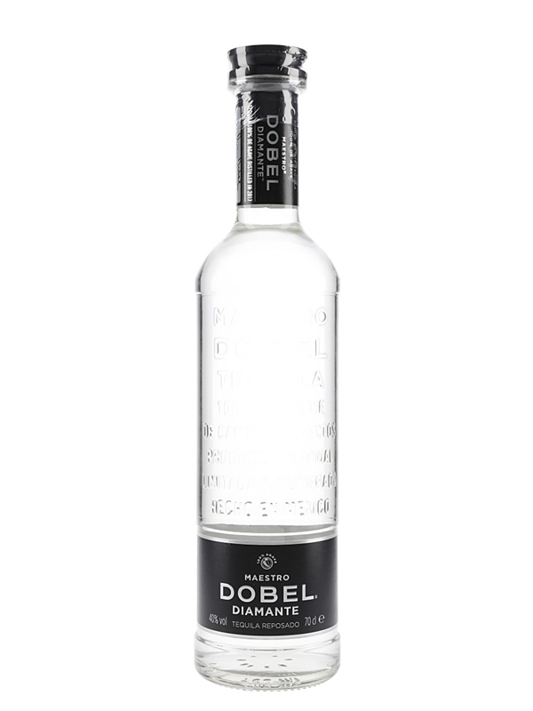A bottle of Maestro Dobel Diamante Reposado 2017, a blend of reposado, añejo and extra añejo 100% agave Tequilas. The blend is then subject to a proprietary filtering process that removes the colour. This was imported to the USA by Proximo Spirits, New Jersey.