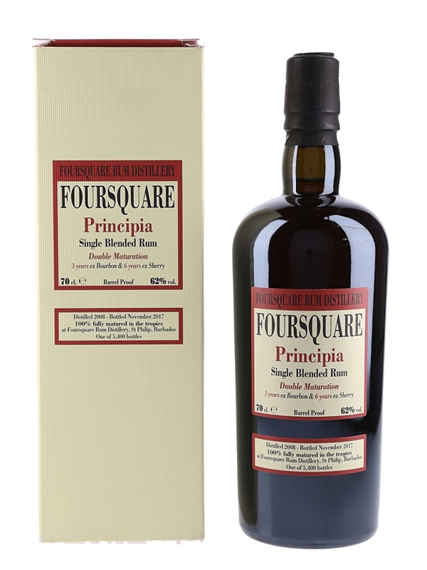 A bottle of Foursquare Principia 9 Year Old Single Blended rum from Barbados. This rum was distilled in 2008, matured in two types of cask, spending three years in ex-bourbon barrels and six years in ex-sherry casks, before blending and bottling in November 2017 by Velier. This is one of 5400 bottles.
