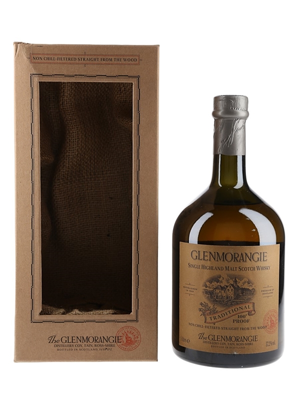 A litre bottle of Glenmorangie Traditional 100° Proof Single Highland Malt Scotch Whisky. This was matured for 10 years before bottling at 57.2% ABV.