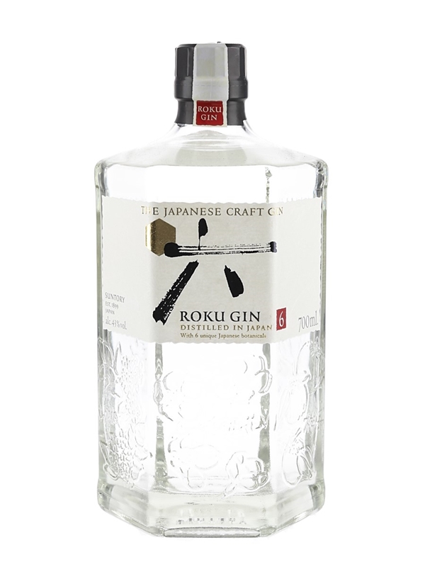 A bottle of Roku Japanese Craft Gin produced by Suntory in Japan and bottled at 43% ABV. Roku means 'six' in Japanese and refers to the six local botanicals used in this gin: Sakura flower, yuzu peel, sencha tea, sansho pepper, sakura leaf and gyokuro tea.