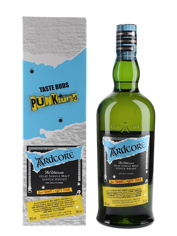 A bottle of Ardbeg Ardcore Islay Single Malt Scotch Whisky, made with black malt barley and bottled at 46% ABV.