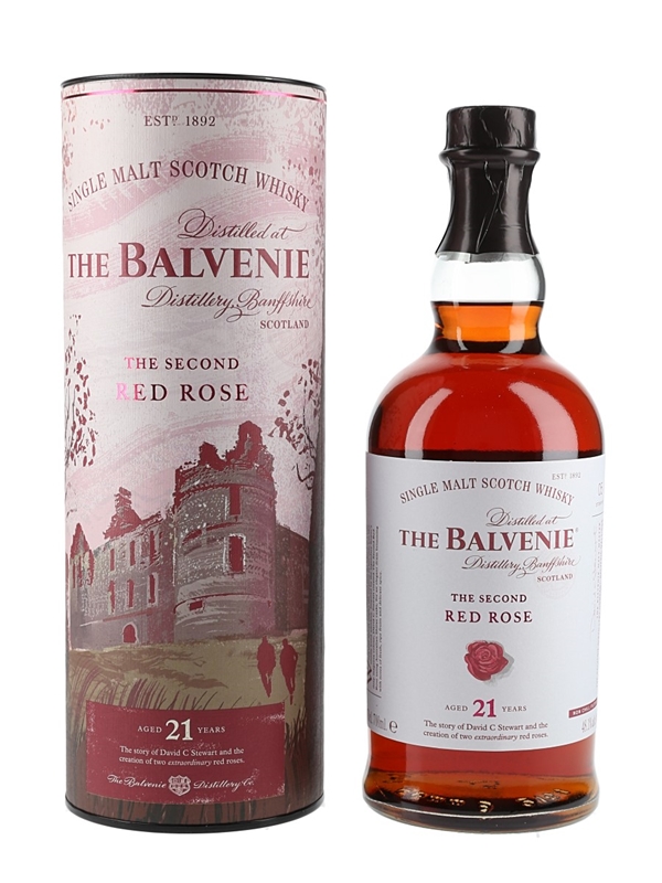 A bottle of The Balvenie 21 Year Old Single Malt Scotch Whisky, The Second Red Rose, matured in Australian shiraz casks and bottled at 48.1% ABV. This is story number 5 in The Balvenie Stories series.