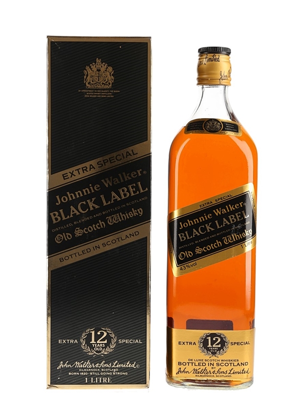 A litre bottle of Johnnie Walker Black Label 12 Year Extra Special Old Scotch Whisky bottled by John Walker & Sons Limited. We estimate this was bottled in the 1980s.