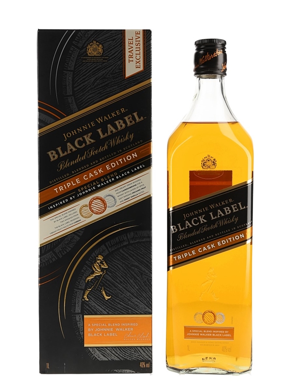A litre bottle of Johnnie Walker Black Label Triple Cask Edition Blended Scotch Whisky, a travel retail exclusive inspired by the Black Label expression. This was finished in traditional whisky casks, Caribbean rum casks and bourbon barrels.