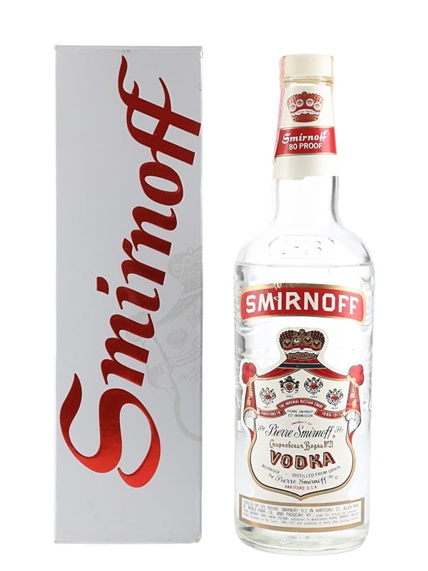 A bottle of Smirnoff Red Label Vodka. This was produced in the USA. The bottling code indicates this bottle was made in 1979.