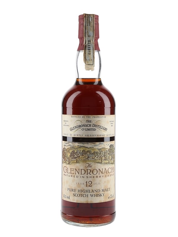 A bottle of The Glendronach 12 Year Old Single Highland Malt Scotch Whisky, matured in sherry casks. This was imported to Portugal by Cockburn Smith & CIA LDA, we estimate in the 1980s.
