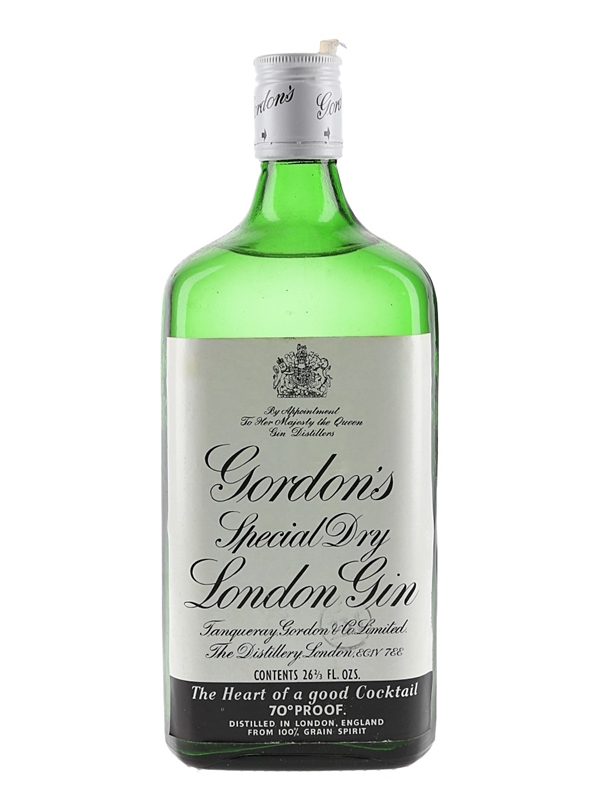 A bottle of Gordon's Special Dry London Gin, distilled and bottled by Tanqueray, Gordon & Co. Limited, The Distillery, London. We estimate this was bottled in the 1970s.
