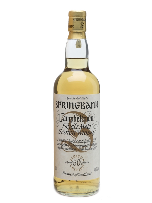 A bottle of Springbank 50 Year Old, one of the oldest official bottles from the distillery. This was originally released as part of Springbank's Millennium Set which included whiskies at 25, 30, 35, 40, 45, and 50 years old.