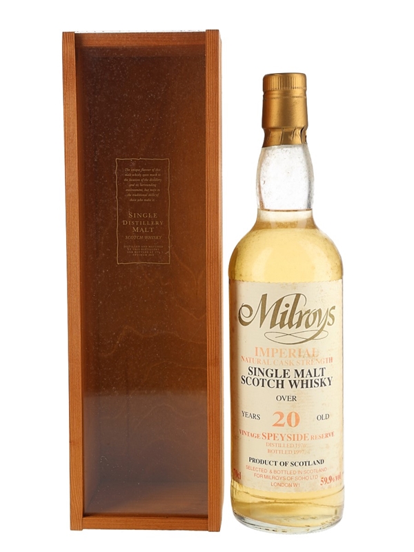 A bottle of Imperial 20 Year Old Speyside Single Malt Scotch Whisky. This was distilled in 1976 and bottled in 1997 at a cask strength of 59.9% ABV for Milroy's of Soho.