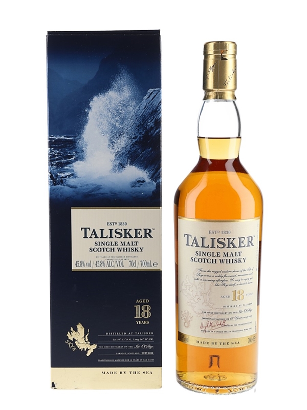A bottle of Talisker 18 Year Old Single Malt Scotch Whisky from the Isle of Skye.
