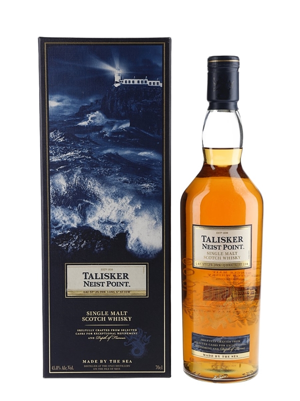 A bottle of Talisker Neist Point Single Malt Scotch Whisky, a blend of young and old whiskies. This was named after a lighthouse on the west coast of Skye.