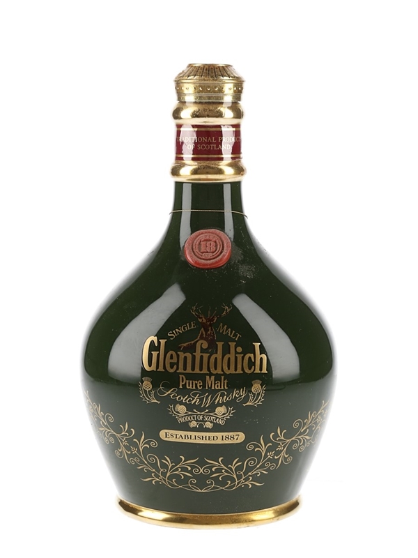 A bottle of Glenfiddich 18 Year Old Pure Malt Scotch Whisky, presented in a green Spode ceramic decanter. We estimate this was bottled in the 1980s.