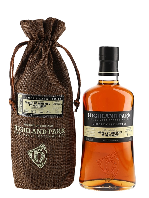 A bottle of Highland Park 12 Year Old Highland Single Malt Scotch Whisky. This was distilled in 2006, matured in a first fill American oak sherry puncheon cask before being bottled at 64.6% ABV in 2018 as part of their Single Cask Series.
