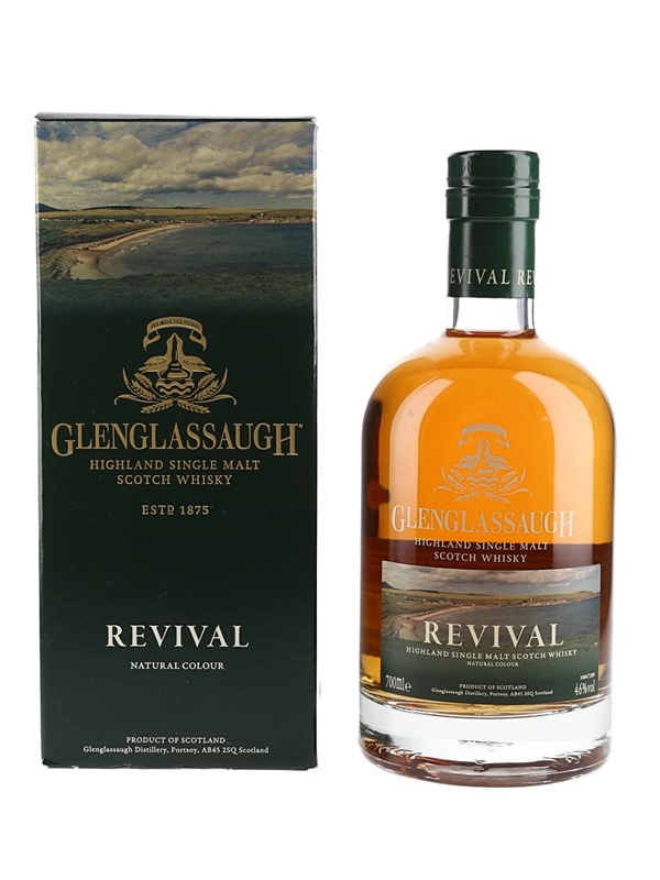 A bottle of Glenglassaugh Revival Highland single Malt Scotch Whsiky, the first whisky produced at the distillery since it reopened in 2008. This was matured in refill and new oak barrels, and finished in sherry casks.