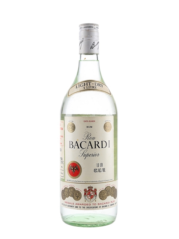 A litre bottle of Bacardi Carta Blanca Light Dry rum distributed by Bacardi International Ltd., Hamilton, Bermuda. This was bottled for Duty Free shops, we estimate in the 1980s.